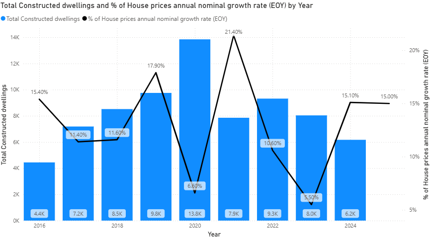 The most recent loan option is about lowered interest rates for first time homeowners and while 2025 data is not fully available yet, we can see another sharp increase rate for price growth. The construction of new dwellings also decreased, but I imagine it will start to increase a bit going forward as buyer intent rises. Based on historical trends supply will likely also increase going forward.