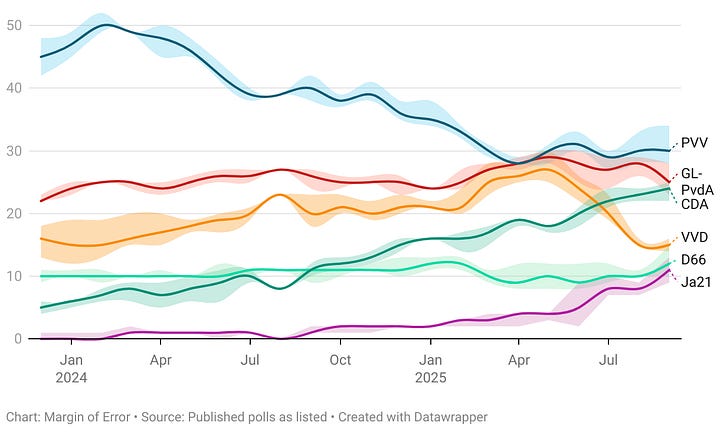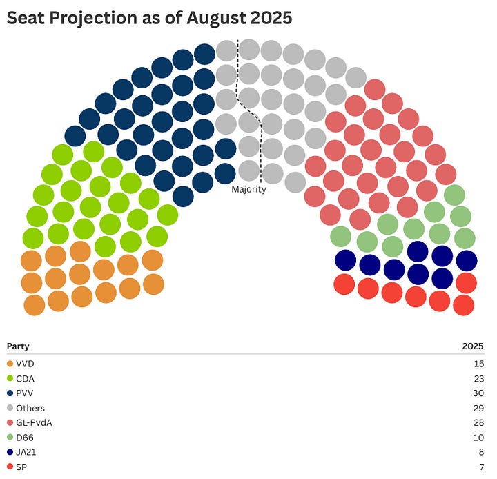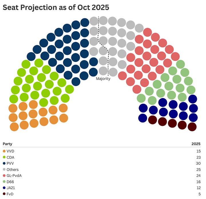 While GL-PvdA could have an easier path to 76 when it comes to potential partners - having historical experience with both the CDA and the VVD, perhaps involving D66 - they would first have to overtake PVV. Even then, GL-PvdA would need their partners to pick up an extra 5 seats and a left-to-center-left coalition would also not reach majority (or even 60 seats for that matter).