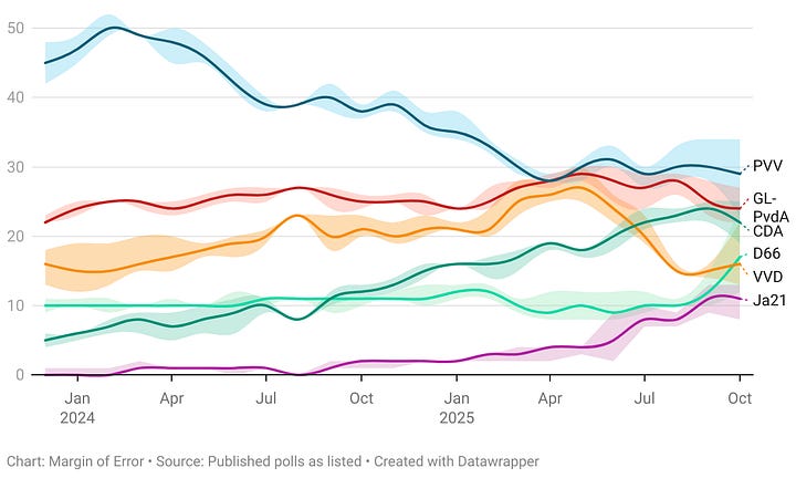 The race continues to be tight, as CDA might come to second place ahead of GL-PvdA; but the confidence bars overlap so theoretically despite the PVV lead it’s possible for GL-PvdA to tie the first place, or come in second ahead of CDA.
